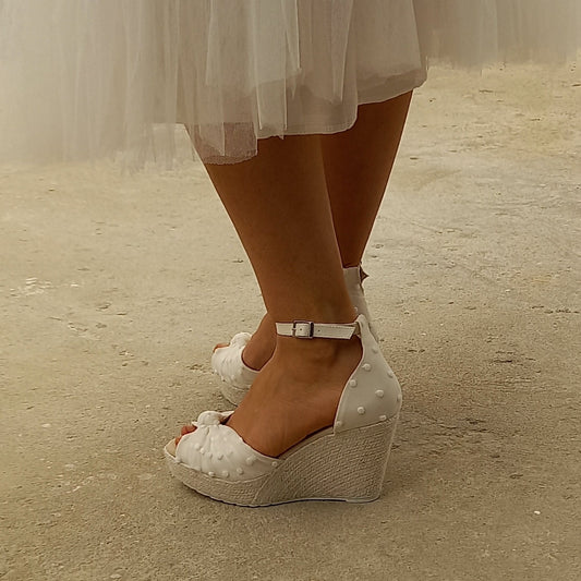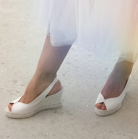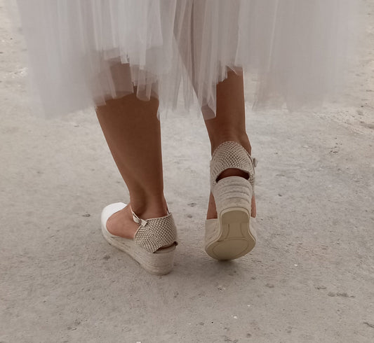 Espadrilles de mariée confortables, élégantes et exclusives. Espadrilles compensées faites main pour un mariage. Sandales idéales pour une cérémonie à la plage ou en extérieur.