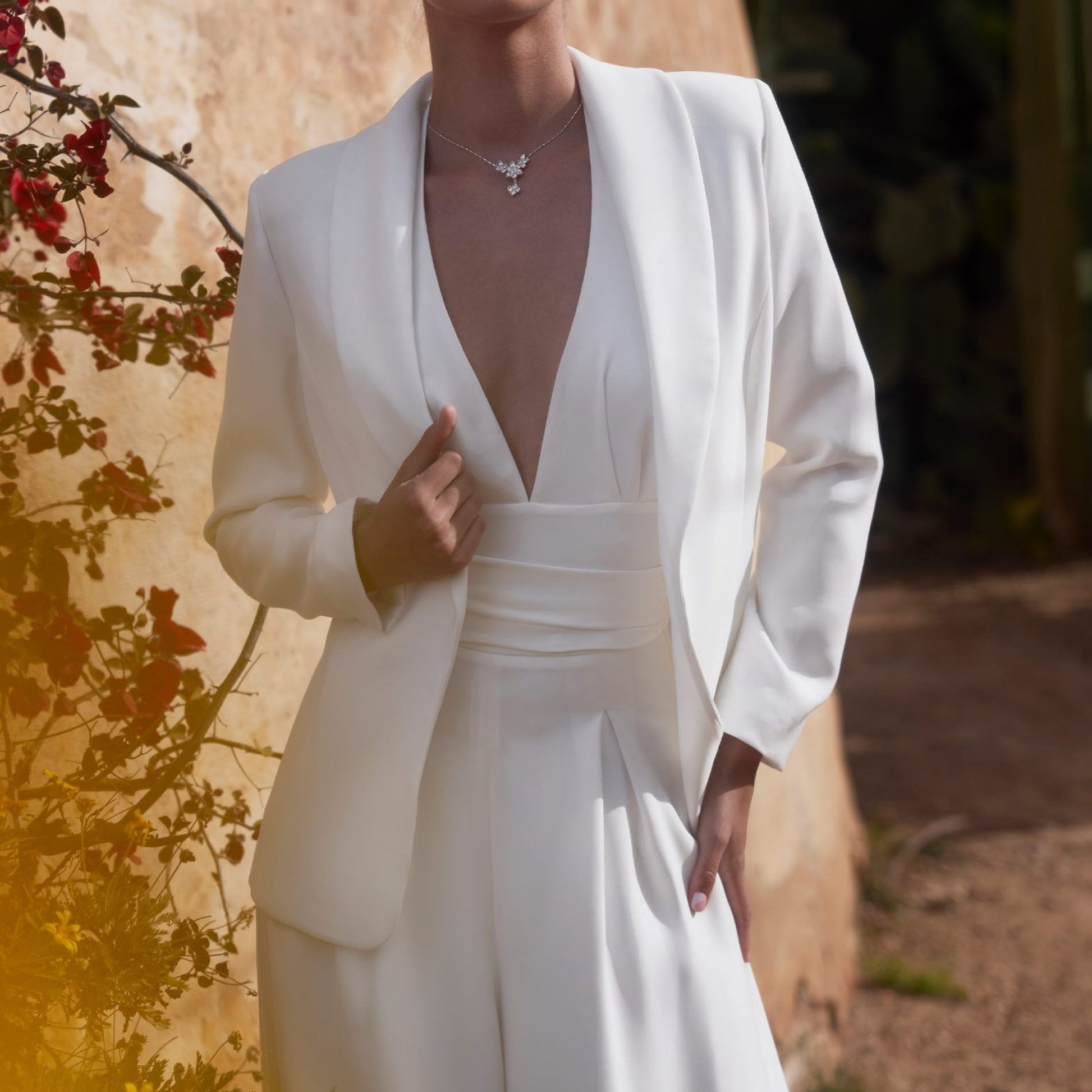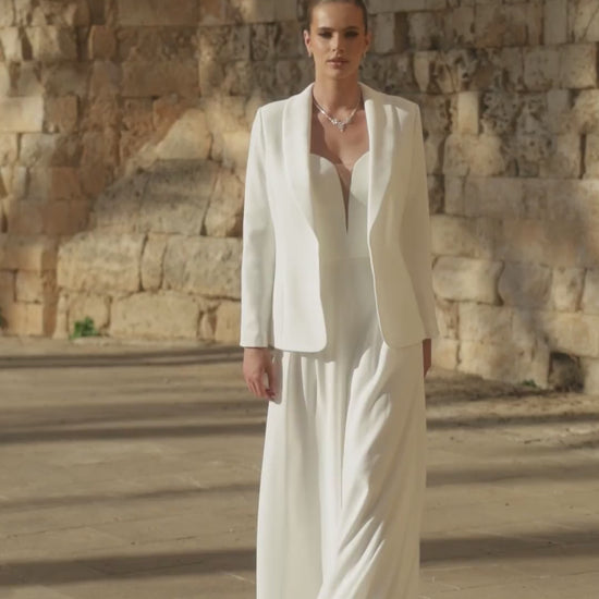 Elevate your bridal look with our Kamelia Long Sleeve Bridal Jacket, made from luxurious stretch crepe. Its formal tailoring and versatile design make it the perfect addition to any wedding ensemble. Ideal for civil ceremonies and weddings in the cooler seasons. Available in Off White.