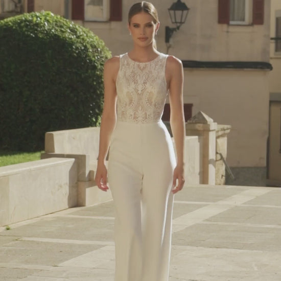 This Bridal Jumpsuit Astra is the perfect addition to the modern bride's wardrobe. The elegant tailored trousers offer both comfort and style, while the feminine lace bodice adds a touch of romance. With a discreet zipper and covered buttons for closure, this jumpsuit is perfect for any bride looking for a unique and sophisticated look.