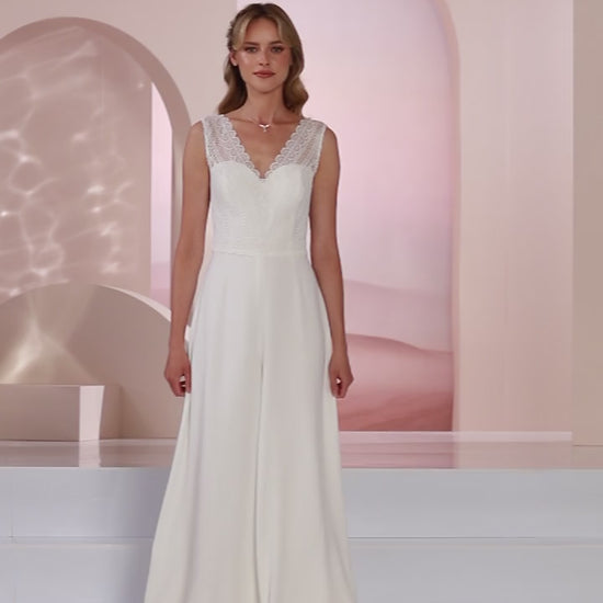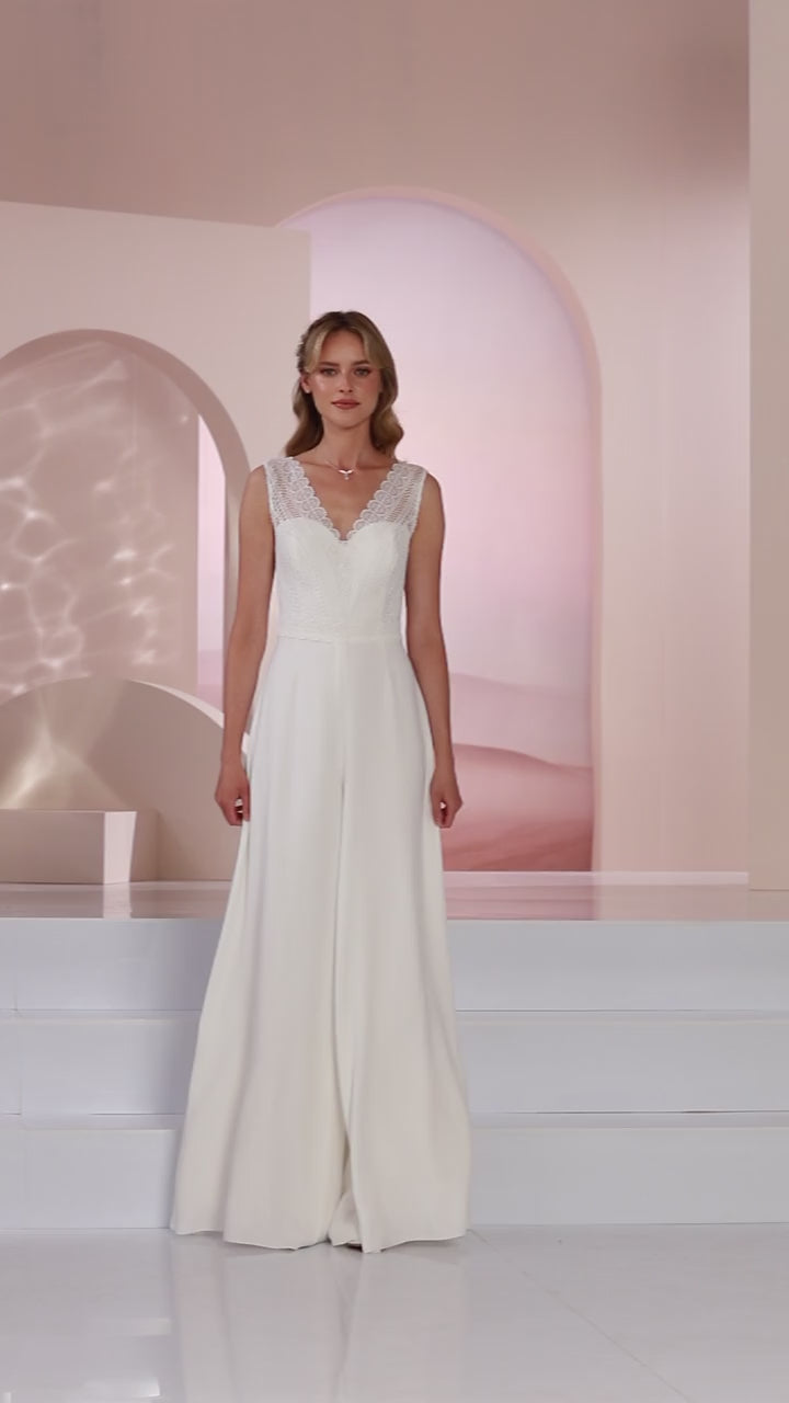 This elegant and flattering bridal jumpsuit is perfect for a civil wedding or for brides looking for something unique. The semi-transparent lace bodice features a deep V-neck and open back, adding a sensual touch. The front is discreetly lined and designed with a sweetheart neckline, while the wide palazzo pants are made from comfortable and drapey crepe. Available in Off White color.