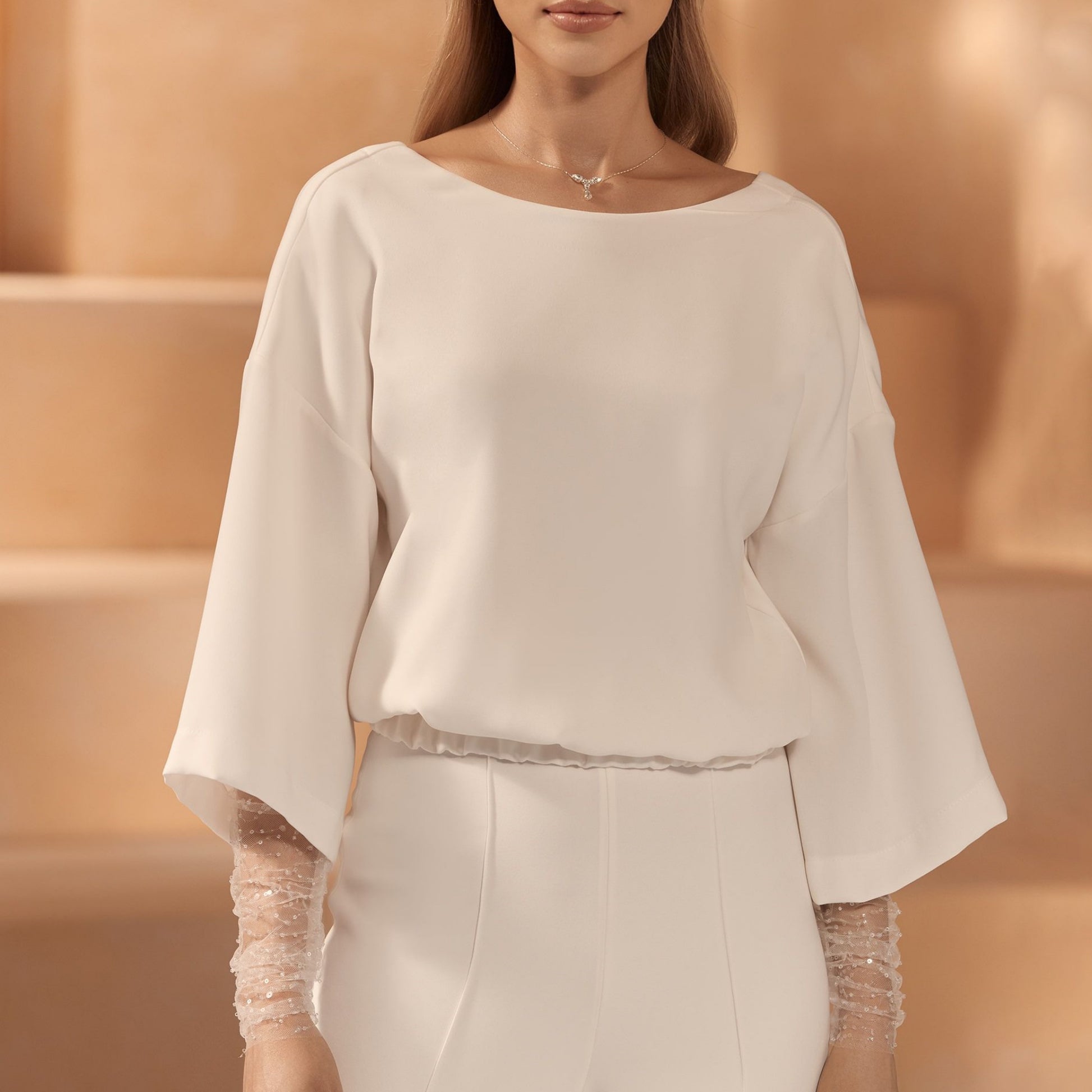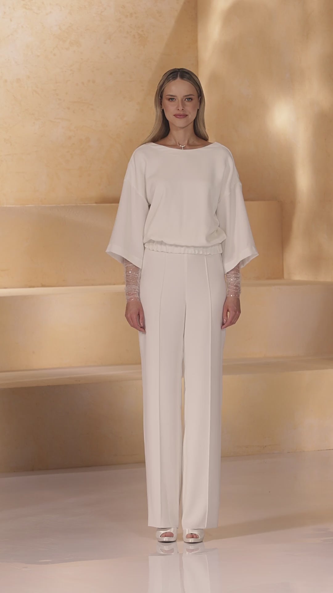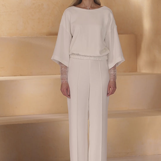 Experience elegance and originality on your big day with our Bridal Separates Pants and Top Claire. Made with stretchy crepe fabric, the straight-cut pants and long-sleeved top bring comfort and style. The top features a waist cinched with elastic and double tulle sleeves adorned with delicate sequins. In off white, this set is perfect for a civil wedding or casual ceremony.
