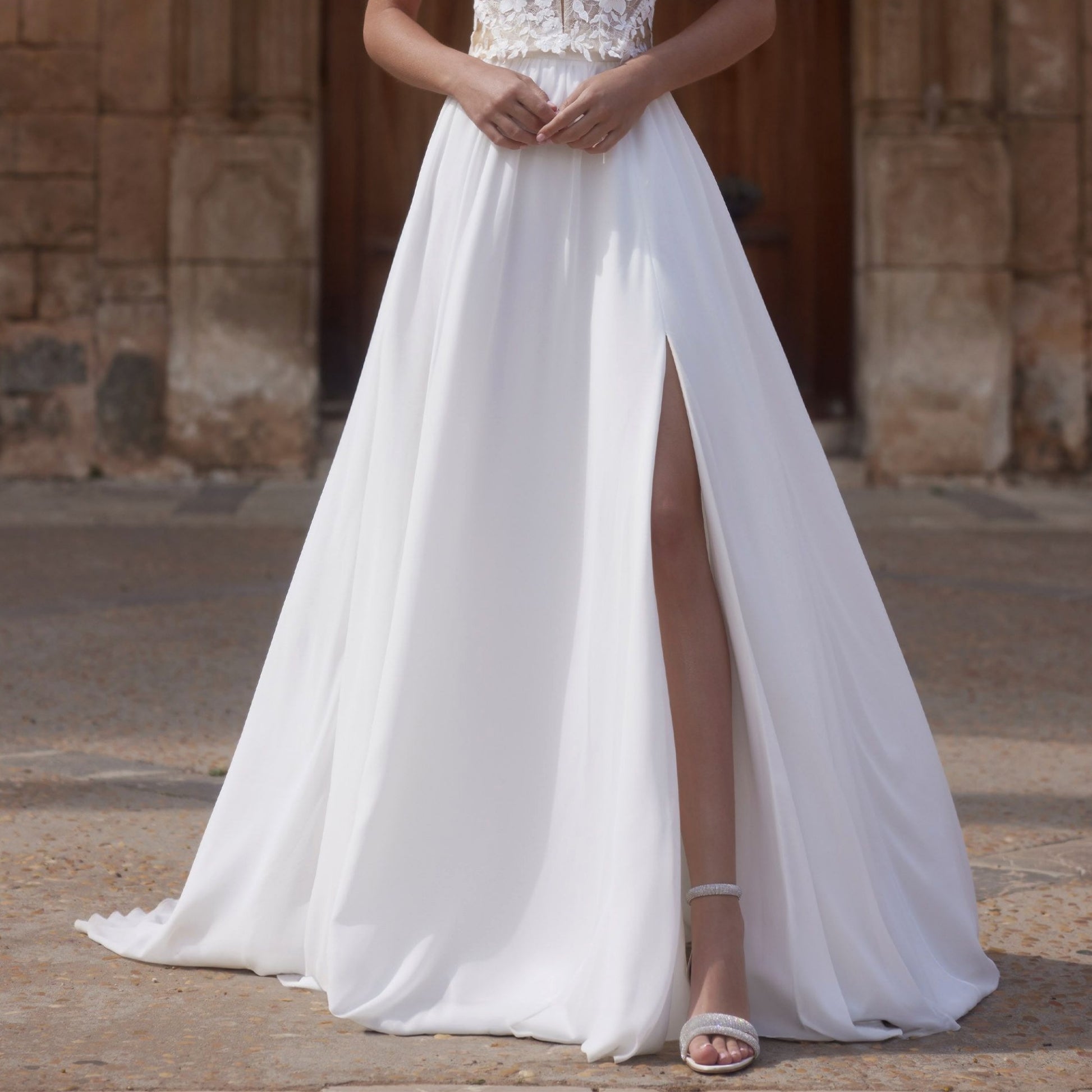 Expertly crafted from luxurious chiffon, our Bridal Separates Skirt with Train and Slit offers the perfect blend of elegance and sensuality. Its deep slit adds a modern touch to the classic train design, while allowing for effortless movement. This versatile skirt can be paired with any of our bridal tops, making it a must-have for your special day.