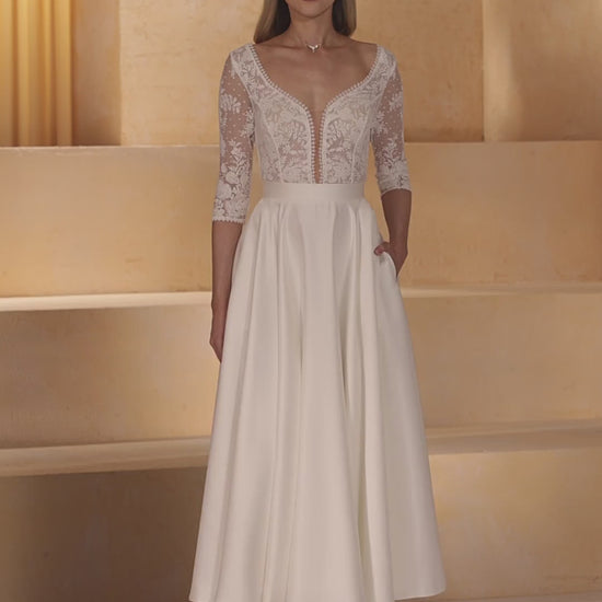 Get ready to walk down the aisle in style with the Two-Piece Bridal Ensemble midi-length Skirt and top. This bridal midi-length elegant skirt and lace top with 3/4 sleeves will make any civil wedding a dream come true. The top features a deep V-neck and back, adorned with beautiful embroidery lace and a zipper closure. Remember to check our size chart and feel free to contact us for assistance.